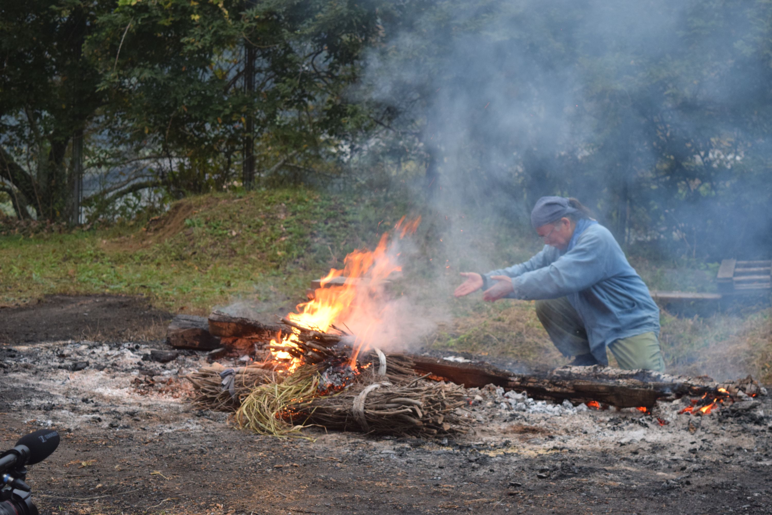 「カムイノミ」では「縄文野焼き」が無事やり遂げられるよう スタッフ全員で野焼きの火を前に、大地や太陽、火や風、森羅万象に祈ります。