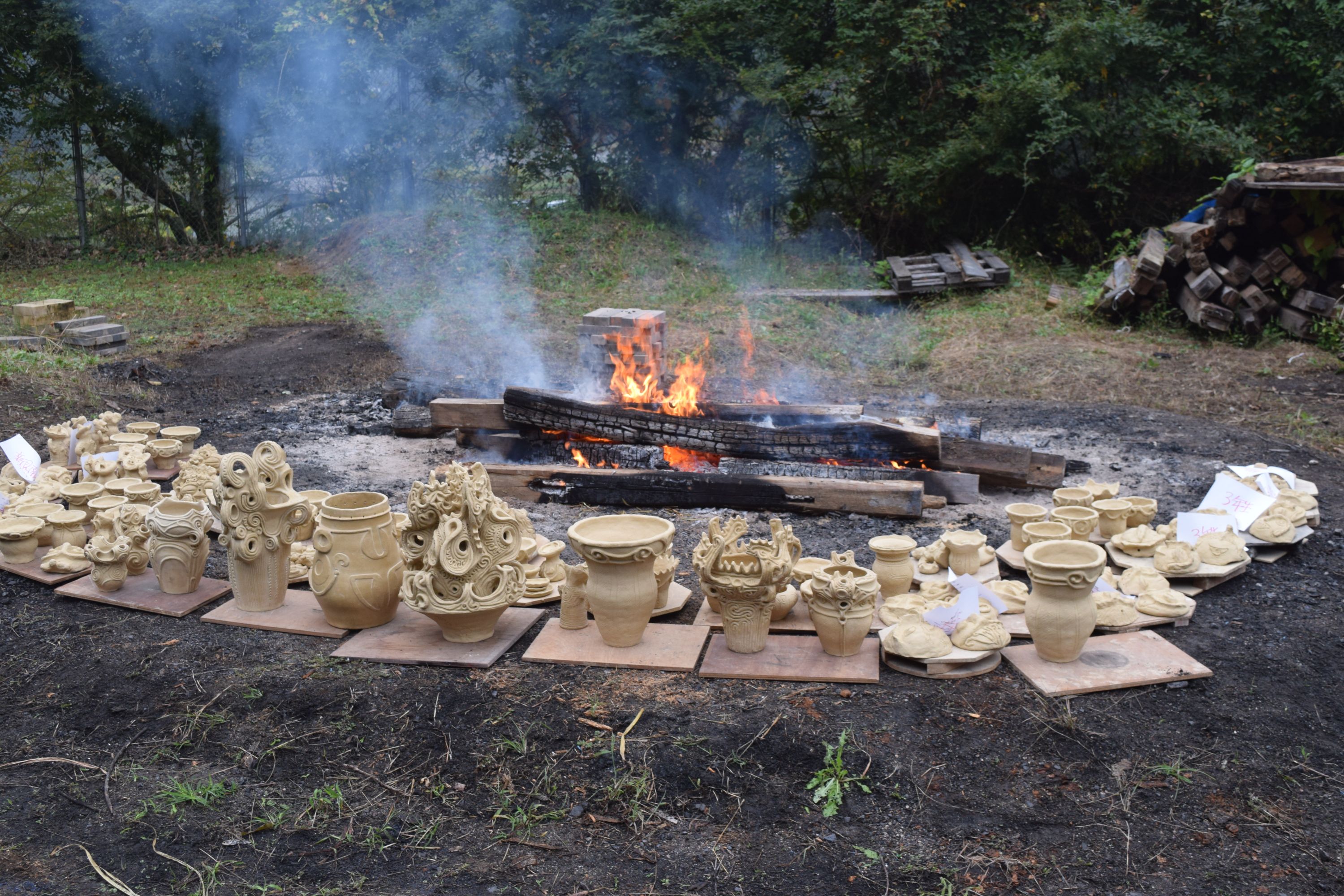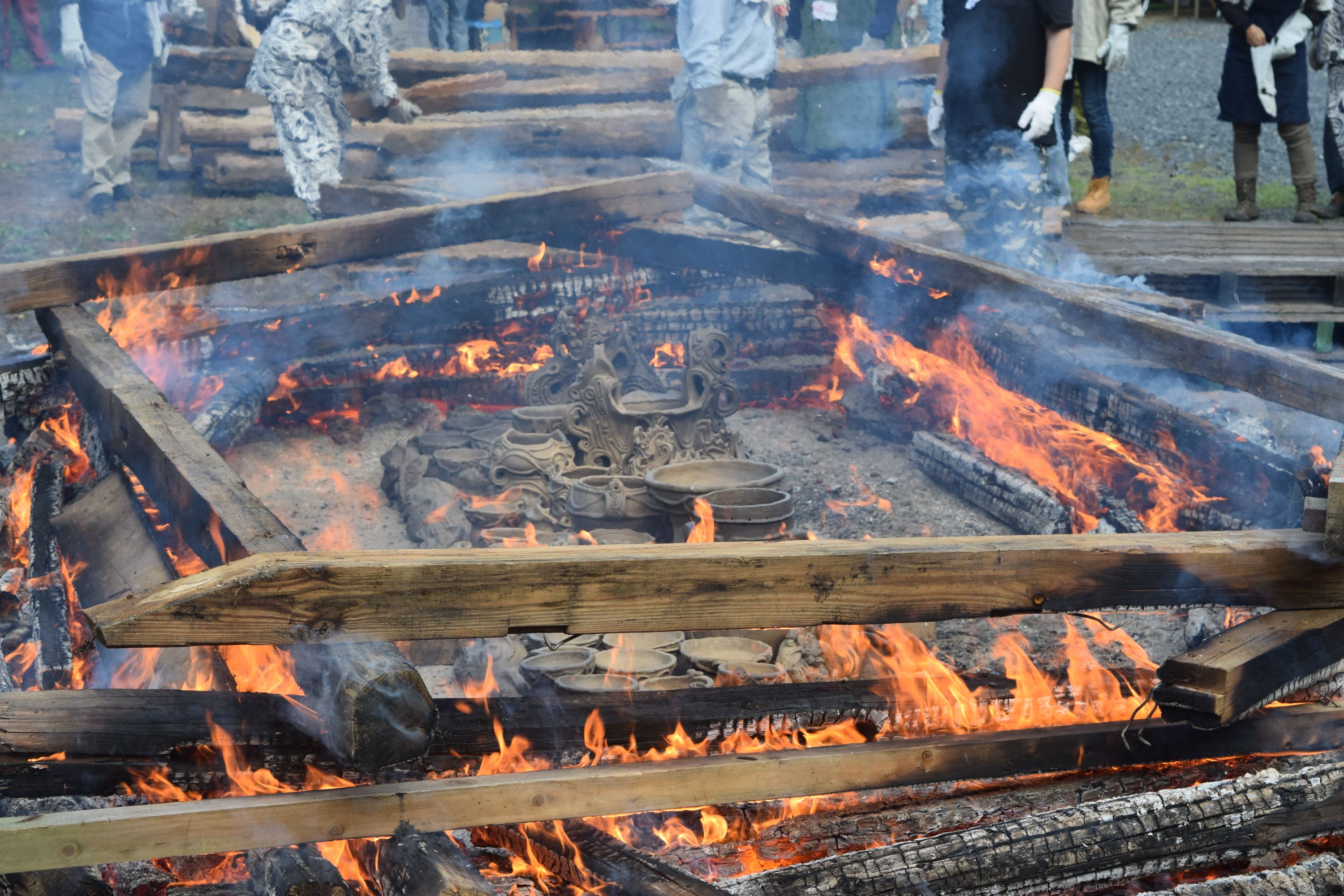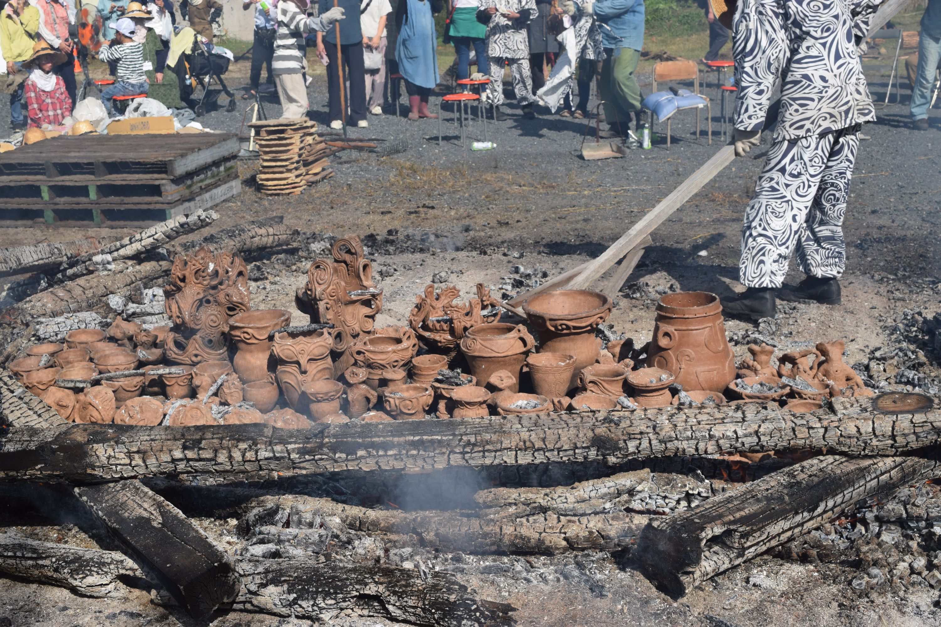 そしてクライマックスの縄文の炎の大きな火柱が立ち昇り、温度も800度越え。炎の子宮から新しい生命の誕生です!縄文土器や土偶、縄文土面やオブジェ、土鈴・勾玉など約150点が無事に焼き上がりました。取り出された作品はみな縄文文様が施され心を込めてつくった素晴らしい作品たち、縄文の魂に触れた命への祈りがこめられ、炎のパワーを宿し輝いています。