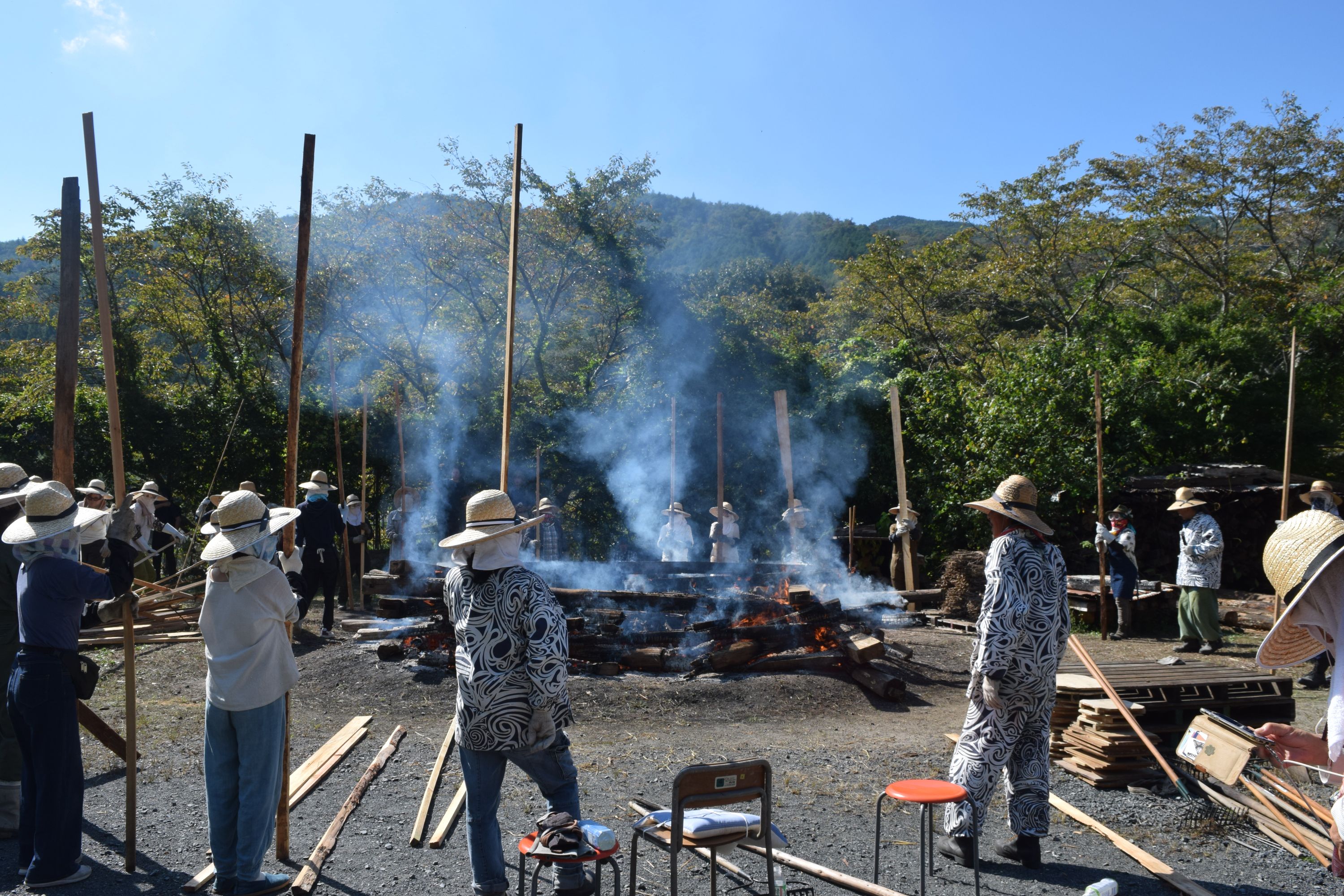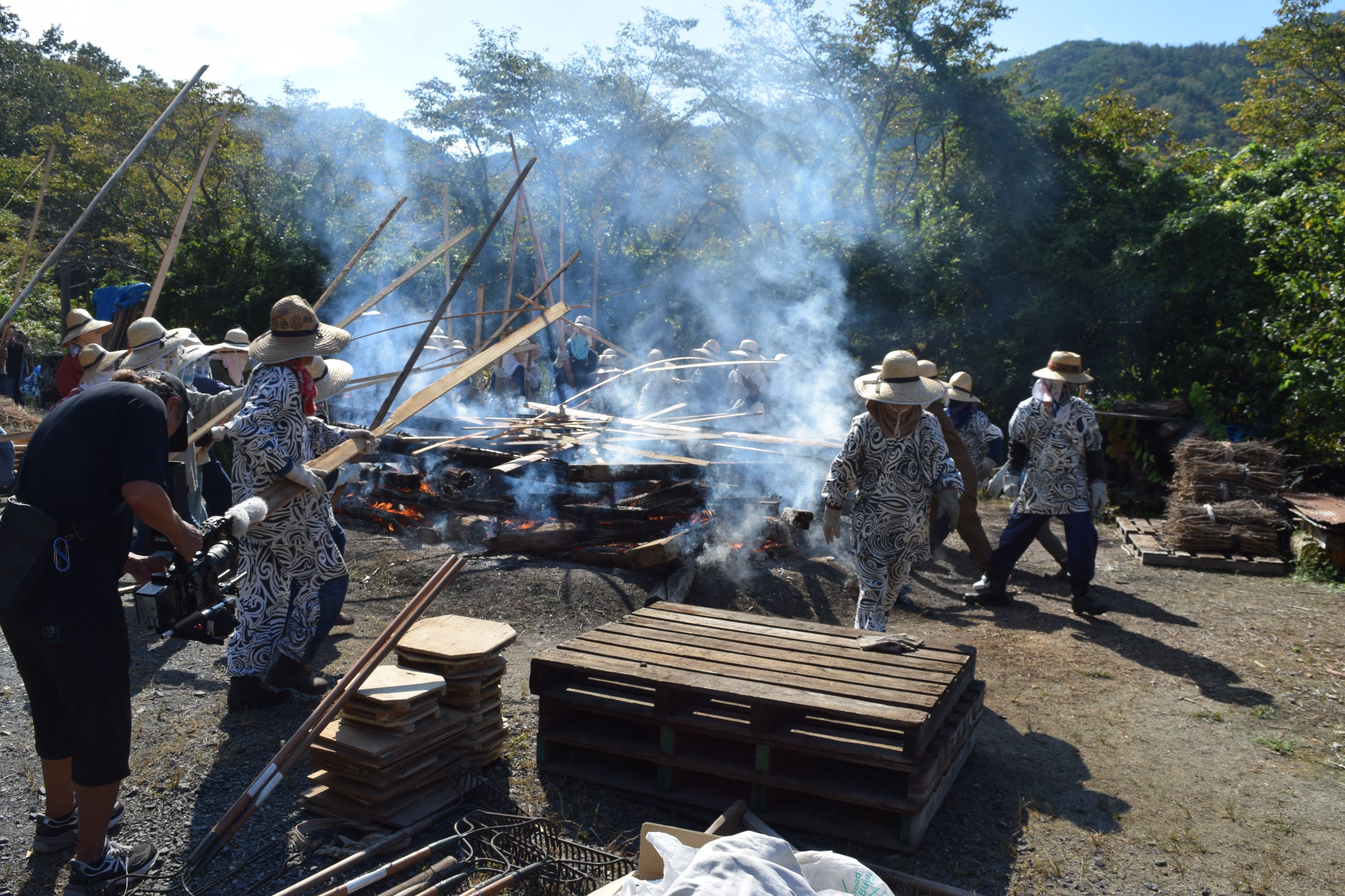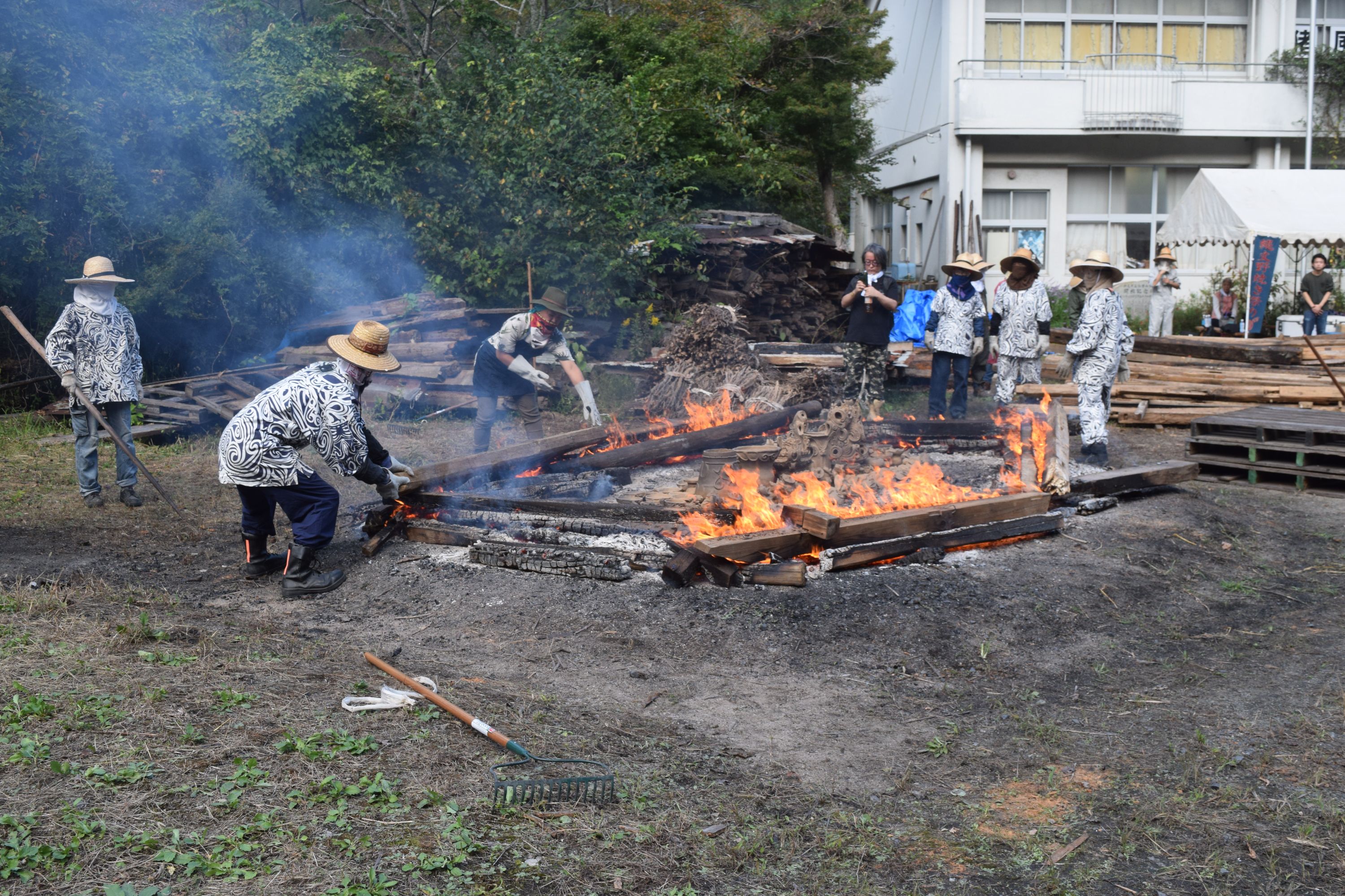 天候も次第に好転し、青空が広がる野焼き日和。作品の色も、温度が上がるほどに黒ずみ始め、濃い茶色に。野焼きスタッフは初めての方も多く、いつもながら女性が多いのですが、大きくて重い材木を3~4人がかりでしっかりと運び配置。日差しが強まり、野焼きの火も大きくなるので、皆汗まみれになりながら力を合わせます。