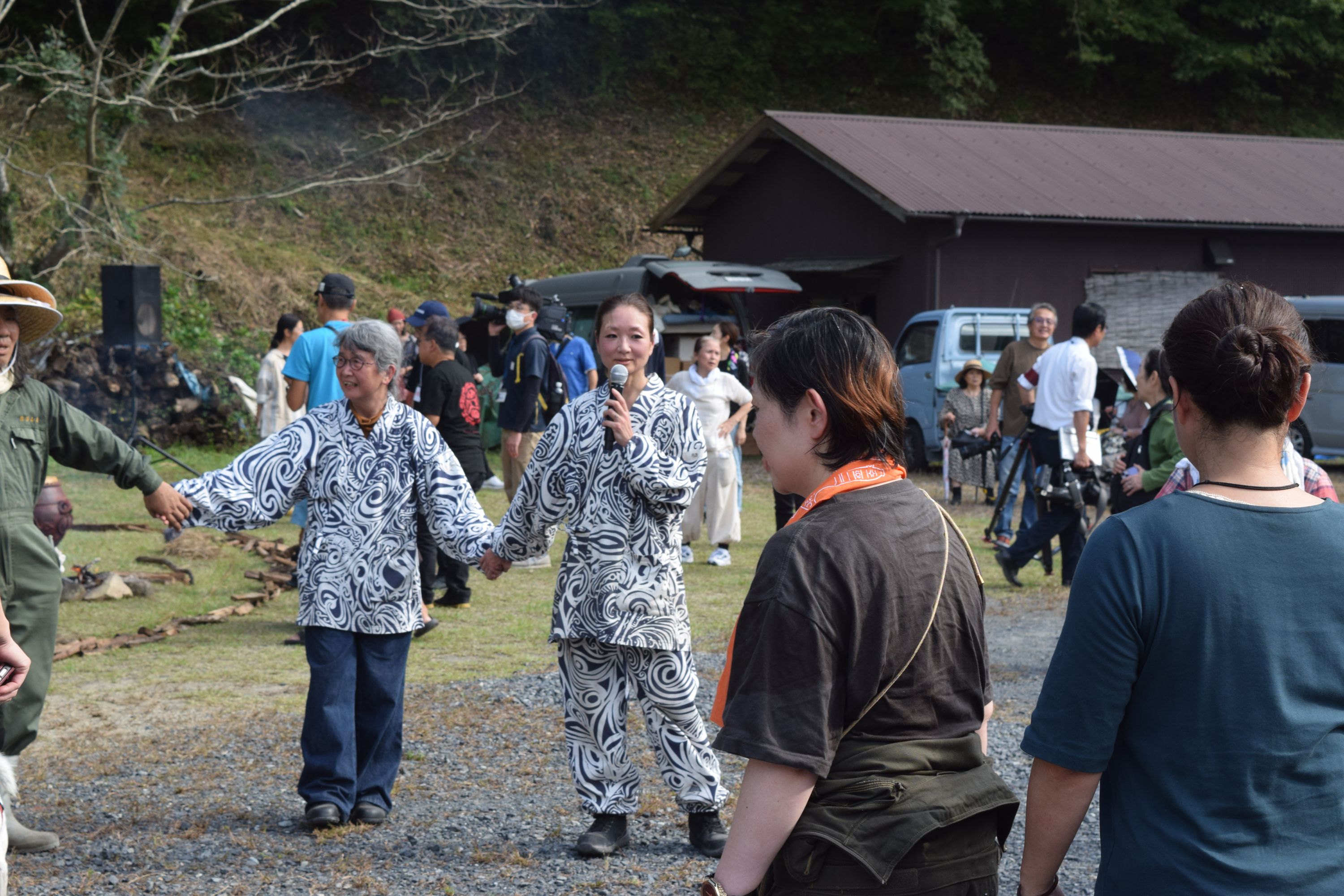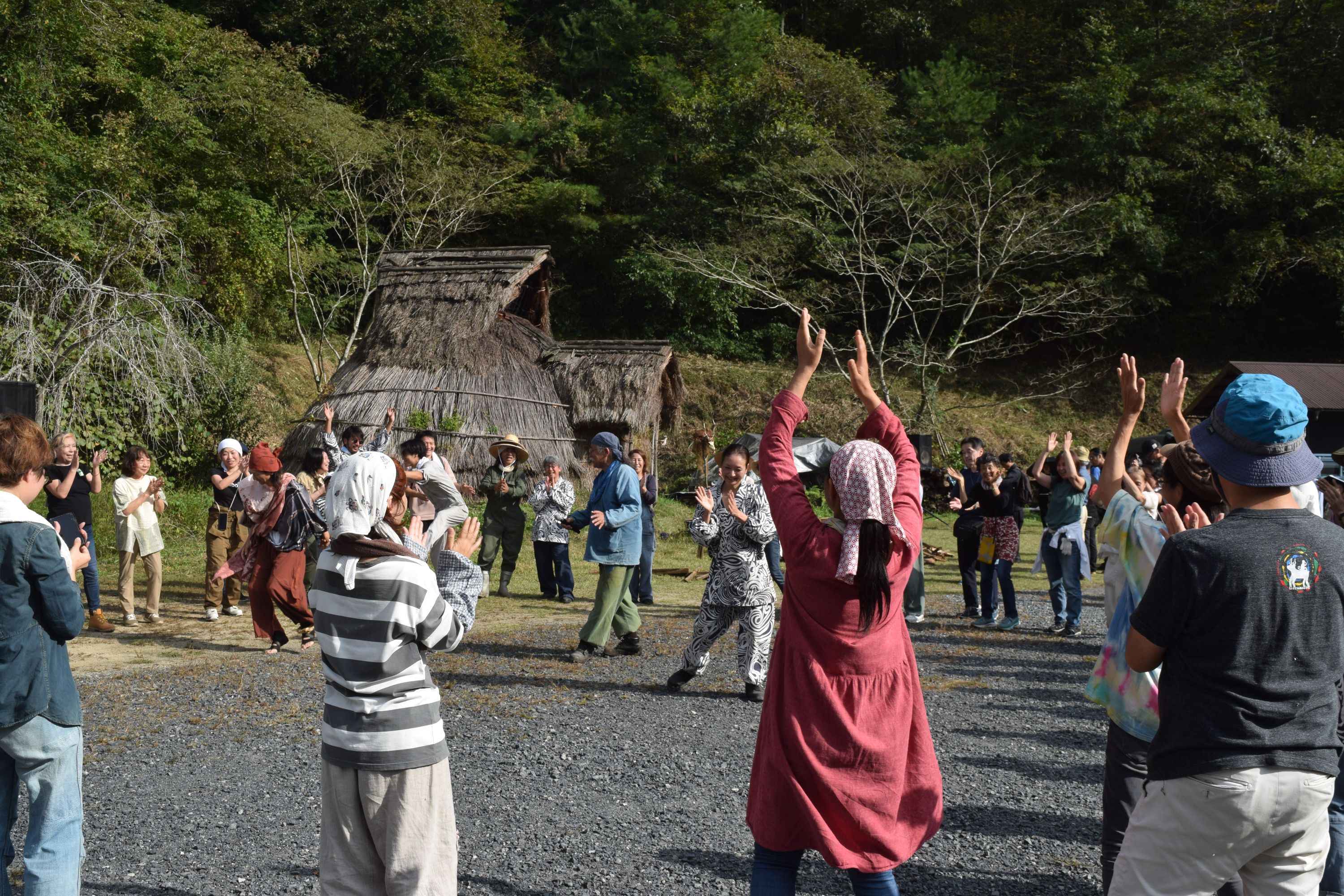 野焼き祭りが無事終えられたことを大地や火への感謝の思いを込めて踊る「縄文大地の精霊ダンス」。2019年以来行っている縄文土器文様を参考に創作したダンス。マイちゃんが今回も踊りを指導、縄文太鼓の音に合わせ 大地を踏みしめ野焼きに居合わせたみんなで大きな輪になって踊りました。